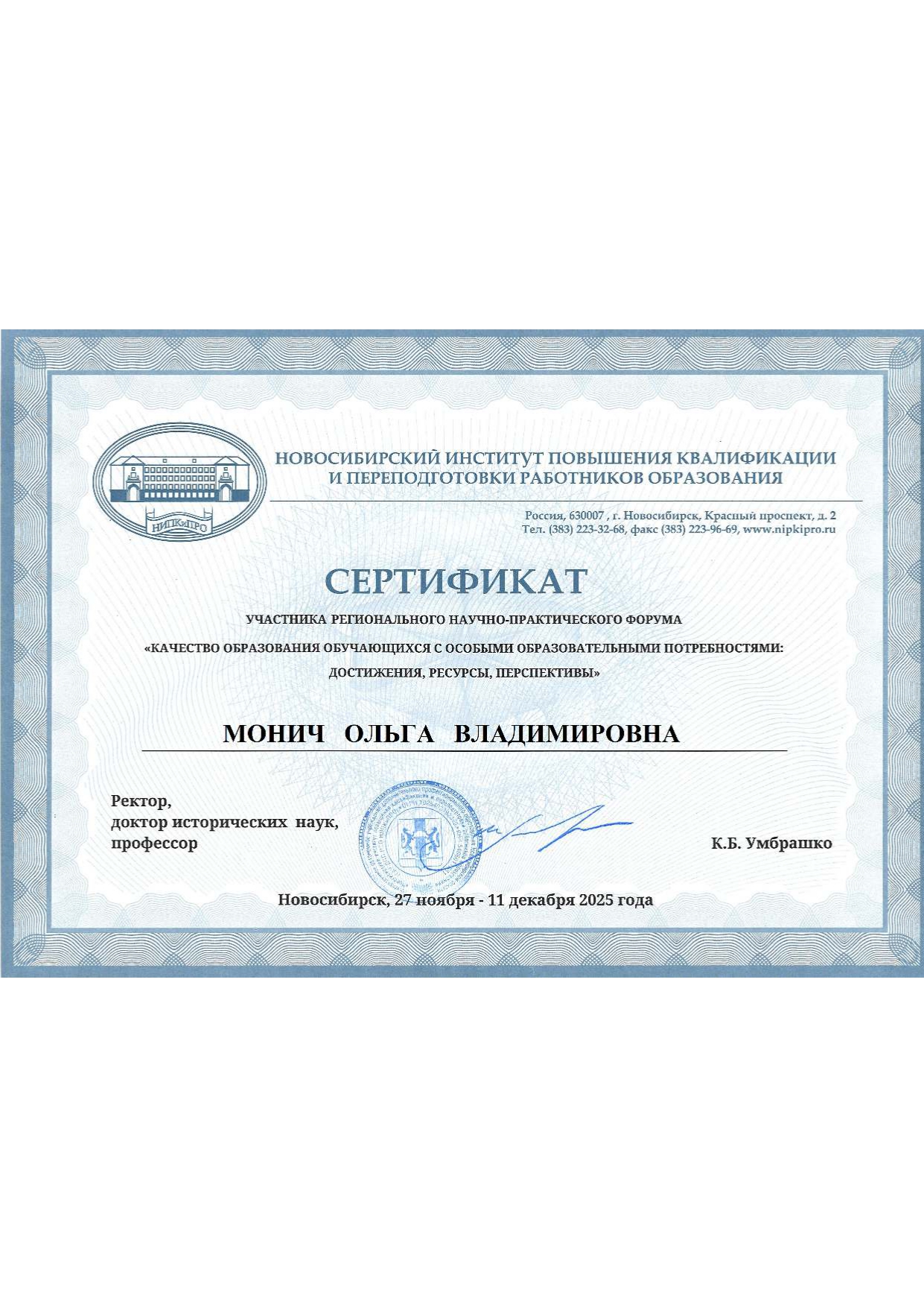 Региональный научно-практический форум "Качество образования обучающихся с особыми образовательными потребностями: достижения, ресурсы, перспективы" Новосибирский институт повышения квалификации работников образования Сертификат участника