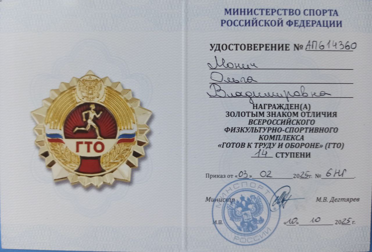 Золотой знак отличия всероссийского физкультурно-спортивного комплекса "Готов к труду и обороне" Министерство спорта Российской Федерации Удостоверение № АП614360